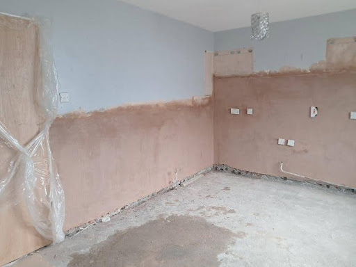The programme involved removing and replacing defective ground floor slabs, installing a new damp proof membrane (DPM), re-plastering, fitting a new kitchen, external drainage and paving works, flooring installation, and full redecoration.